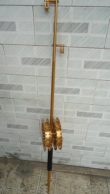1左线轮。一般设定安装主放线,应在上方。在牵线过河时,将左线轮的主 线拉出一小部分穿过抬竿的左上滑轮后,再由上向下穿过背竿滑轮,将线头上打一个 稍微比上滑轮大点的小圈挂在抬竿的右上滑轮上,**实现了单线双放的设置。这时, 你拉动主竿或背竿,用姆指轻轻压住线轮外缘,**可轻松实现一线双放的功能;